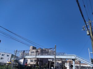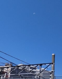 真っ青な空のやや上の方にある白い点が、月です(スマホ撮りなもんで)。